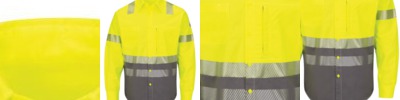 - Color blocked shirt with hi vis upper half for ANSI compliance and grey lower half to conceal dirt and stains