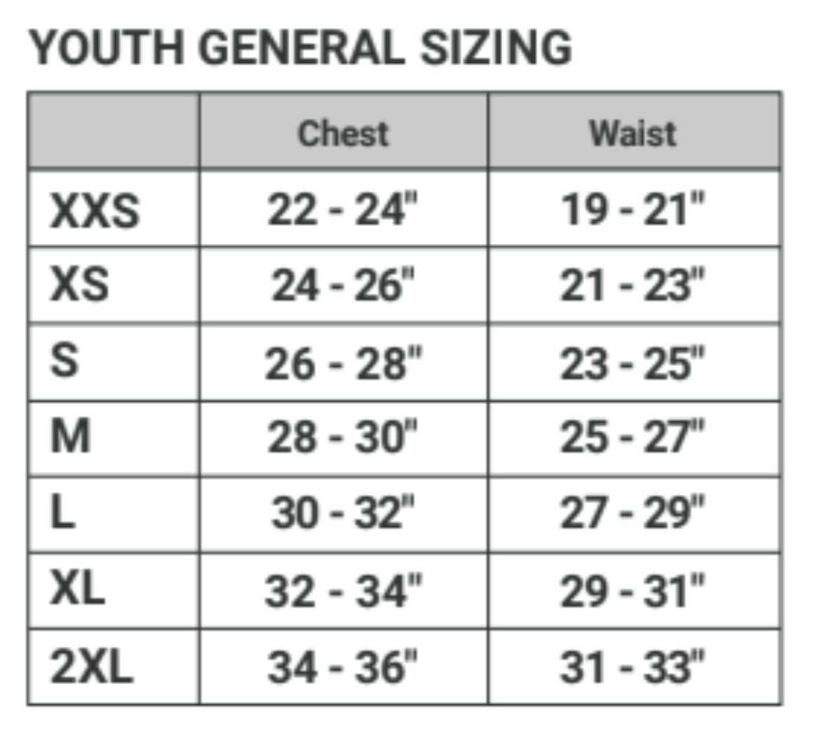 - Youth sizes: S(6/8), M(10/12), L(14/16)